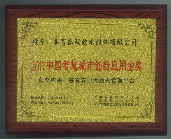 蒼穹數(shù)碼技術(shù)股份有限公司榮獲“2017年中國智慧城市創(chuàng)新應(yīng)用金獎”
