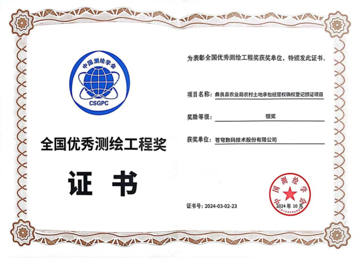 作為中國領先的地理信息開發及服務商,蒼穹數碼于測繪地理信息領域持續深入耕耘,成績顯著。主導研發的“彝良縣農業局農村土地承包經營權確權登記頒證項目”,憑借嚴謹的工作態度、先進的技術手段以及高質量的成果展現,榮膺“全國優秀測繪工程銀獎”。此項目的成功,不但彰顯了我們在測繪工程領域的專業水平與卓越能力,而且是對保障農村土地權益、助推農業現代化發展方面所作貢獻的高度肯定。