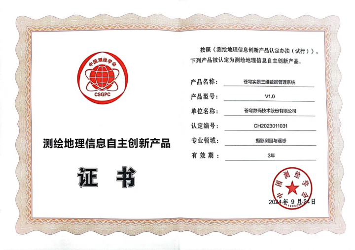 同時,“蒼穹實景三維數據管理系統” 憑借創新性的技術架構、強大的功能和廣泛的應用前景,獲得了“測繪地理信息自主創新產品”。這一榮譽彰顯了蒼穹數碼在技術研發方面的不懈努力和勇于創新的精神。該系統為測繪地理信息行業帶來了新的發展動力,為實現實景三維數據的高效管理和深度應用提供了有力支撐。