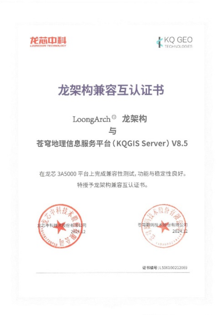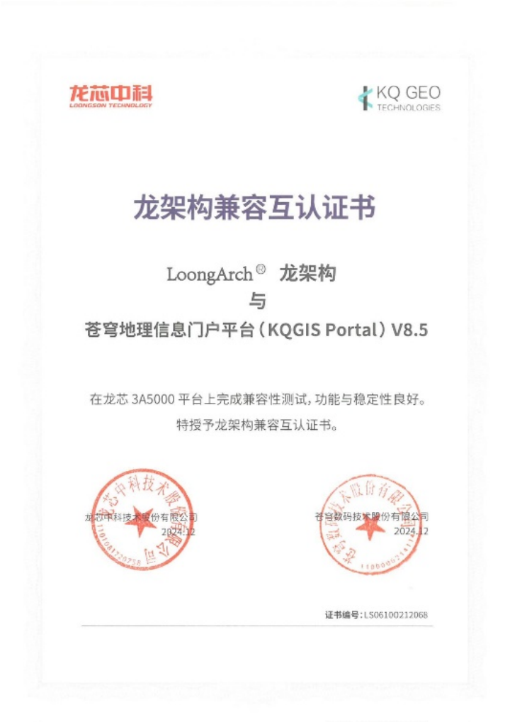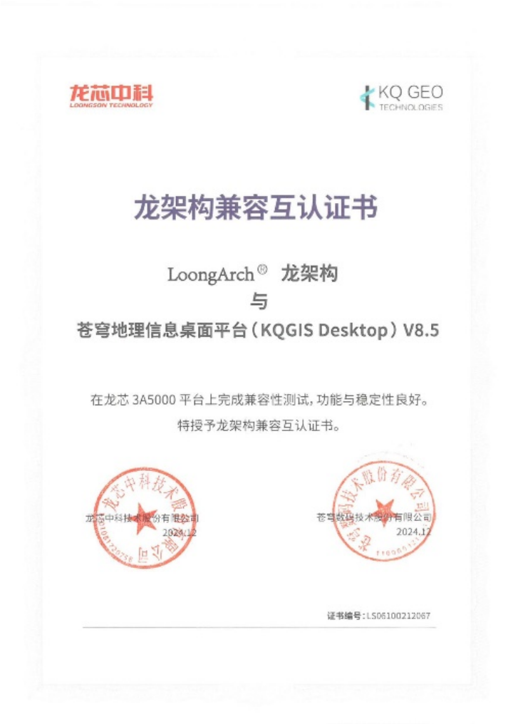 蒼穹數碼和龍芯中科的產品適配認證,是雙方共同開展的一項覆蓋產品功能完整性、性能穩定性以及安全性等多個關鍵維度的測試活動。經過嚴謹和細致的測試,證明KQGIS在龍芯環境上運行流暢,性能卓越,能夠完全滿足用戶對于關鍵性應用的高標準需求。本次適配認證也意味著蒼穹數碼在國產環境廣泛兼容性上又得到了進一步提升,能夠為用戶提供更加優秀的GIS產品。