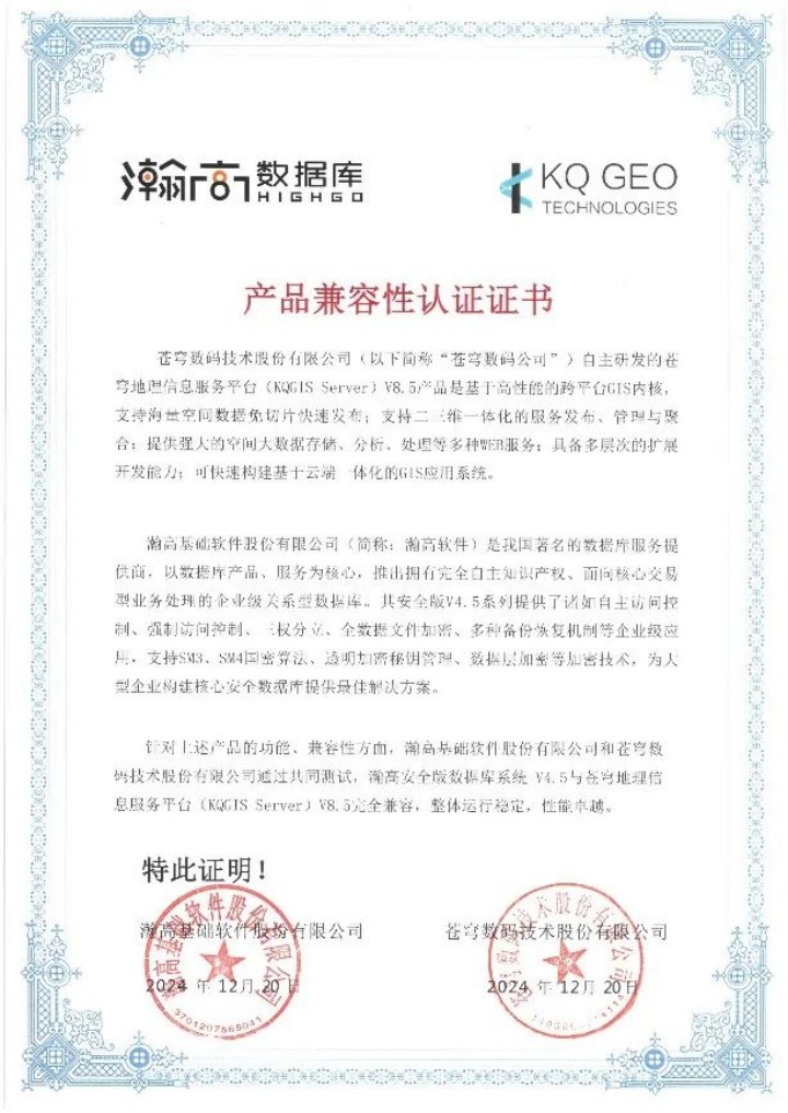 蒼穹數碼和瀚高數據庫的產品適配認證,是雙方共同開展的一項覆蓋產品功能完整性、性能穩定性以及安全性等多個關鍵維度的測試活動。經過嚴謹和細致的測試,證明KQGIS在信創環境上,能夠和瀚高數據庫友好兼容,運行流暢,性能卓越,能夠完全滿足用戶對于關鍵性應用的高標準需求。本次適配認證也意味著蒼穹數碼在國產環境廣泛兼容性上又得到了進一步提升,能夠為用戶提供更加優秀的GIS產品。