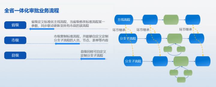 針對市縣組卷審查效率低下、省級層面又難以實施全面監管等突出問題,江蘇省用途管制一體化審批系統采用新一代工作流框架,引入業務流程分級授權技術,實現省、市、縣多級業務一體化線上辦理、聯動審批與信息回流,顯著提升全省用地項目審批的規范性與時效性。在業務規范方面兼顧全省統籌與地方特色,支持省級層面定義從市縣級勘測定界、組卷、初審、到省級審查的標準化主線流程,各設區市協辦處室可根據本地實際情況個性化定制分支子流程節點與表單,保障全省一體化標準下,地方特色業務辦理需求也能得到充分支持;在辦件效率方面強化省廳監管,支持對各環節辦理時限提醒與限制,以全流程線上辦理落實省廳全程跟蹤監控。