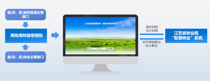聚焦既往土地和林地管理分散、多窗口審批致使群眾來回奔波、耗時漫長的難題,對接打通江蘇省用途管制一體化審批系統與江蘇省林業局“智慧林業”系統,實現報件材料、補正意見、業務審核意見等數據的雙向共享和業務聯動,面向省及省以下批準農用地轉用、城鄉建設用地增減掛鉤和審核林地許可事項,全面實行用地用林合并審批。以江蘇省用途管制一體化審批系統為主體,進行用地用林組卷報批,統一上傳用地用林審批材料,并將使用林地審核材料推送至“智慧林業”系統,審核出具用林審查意見后,將審批結果通過數據交換接口返回至江蘇省用途管制一體化審批系統,實現統一接件、統一補正、并聯審批、統一批文,為群眾和企業提供更為便捷、高效的服務體驗。