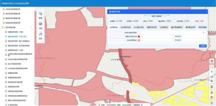 針對項目申報多補正、有退件的問題,沿用江蘇省建設用地審批系統中的帶圖審批能力,省市縣三級部門依托統一的底圖開展業務審批工作,并將一鍵圖審功能、業務審查功能前置至縣、區組卷階段,實現在報件組卷環節即可分析審查報批地塊是否存在規劃沖突、占用生態管控空間、占用永久基本農田等問題,通過技術性輔助審查前置減少后續補正、退件的耗時。并同步建立圖形審查結果緩存機制,系統自動存儲管理前序審核環節的圖形審查結果,當流轉到后續廳局領導審核節點時可直接調取前序圖審結果,無需重復分析,從而提升審批效率。
