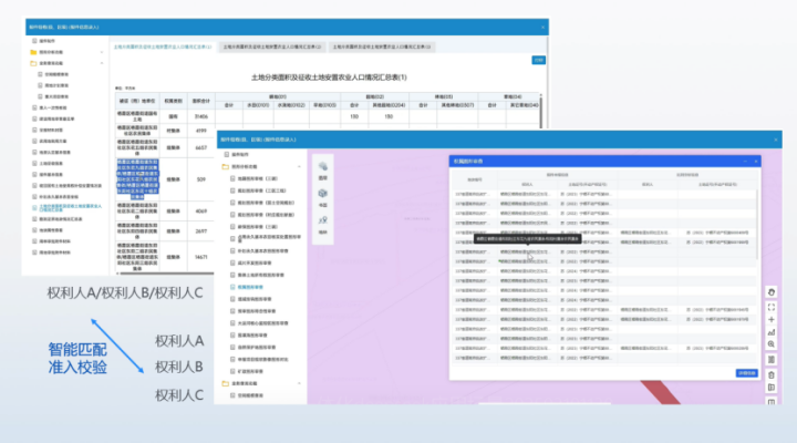 同時提供準入一體化核驗功能進一步減少補正、退件問題,通過構建準入審查分析規則,強化對報件數據格式規范、部用途管制監管規范、省廳業務準入規范、空間準入規范四個層面的一體化核驗,保障所有業務要素、技術指標嚴格契合部、省兩級審批標準,有力確保部用途管制監管通過率達到100%。為提升準入核驗的精準度與智能化水平,引入DeepSeek大模型,借助其強大的知識圖譜構建與語義理解分析能力,實現用地審批中被征(用)地單位權屬名稱與不動產權利人名稱的智能比對核驗,規避因命名邏輯不一致而導致的準入判斷錯誤問題。