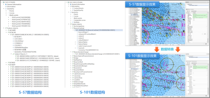 此外,系統還提供了不同格式之間的數據轉換工具,可一鍵實現S57轉S101、測深數據轉S102,并實時可視化呈現,為S100系列產品的支持提供基礎。