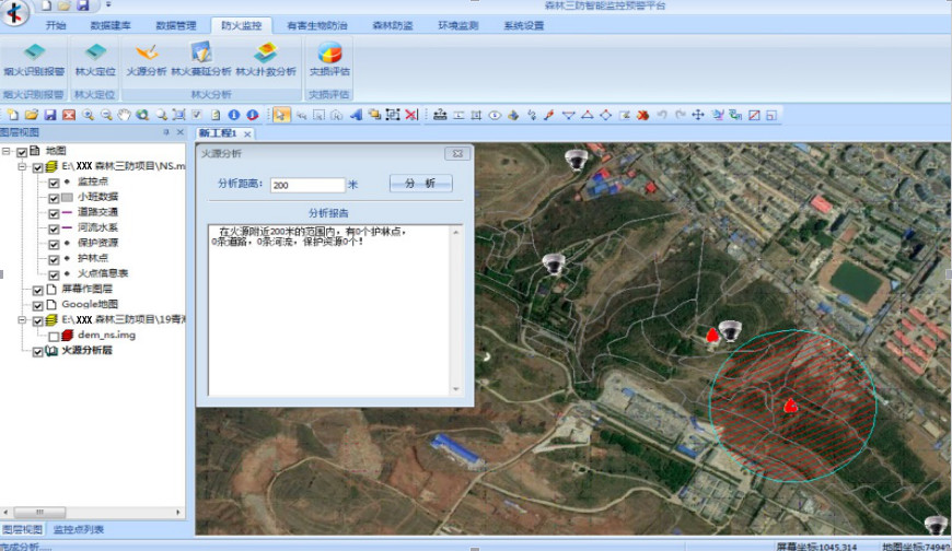 自動分析出該火源點周圍的相關設施、救援物資、救援力量以及火險隱患情況,為林火撲救提供參考。
