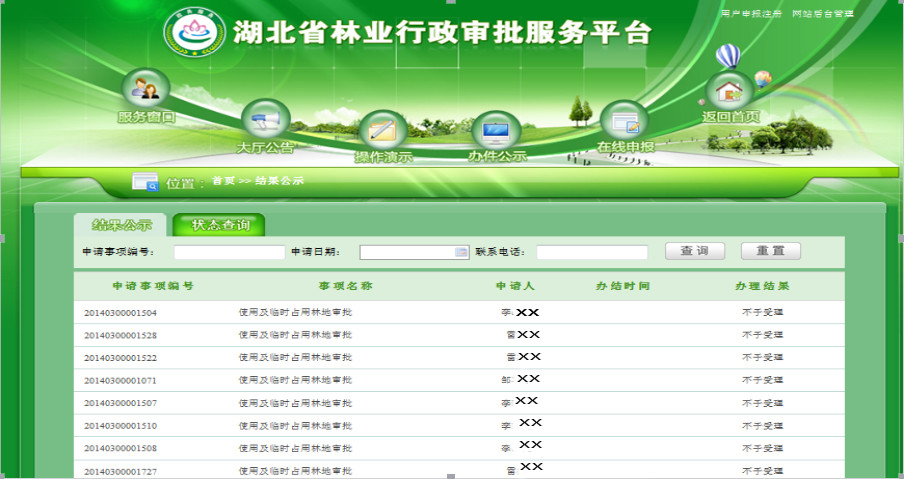 對(duì)林業(yè)行政審批各個(gè)環(huán)節(jié)、子流程全程進(jìn)行監(jiān)督管理,相關(guān)監(jiān)督部門或各級(jí)領(lǐng)導(dǎo)可以通過(guò)日志審計(jì),辦理狀態(tài)信息查詢等功能對(duì)在辦以及已辦事項(xiàng)情況進(jìn)行監(jiān)督,并根據(jù)相關(guān)規(guī)定對(duì)不符合規(guī)范或者逾期的事項(xiàng)進(jìn)行處理。